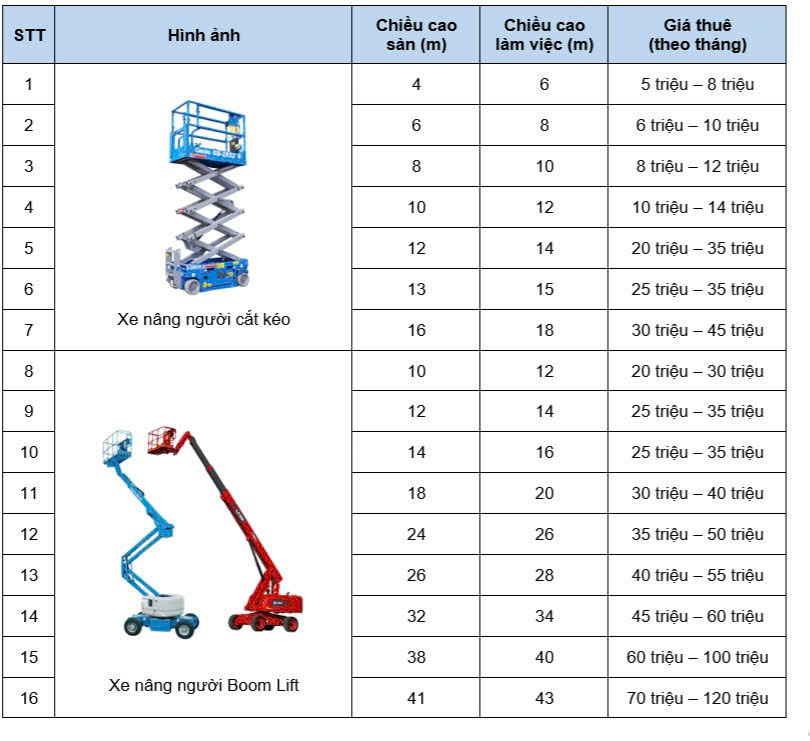 Chúng tôi cung cấp bảng giá thuê xe nâng người linh hoạt theo loại xe và thời gian thuê.